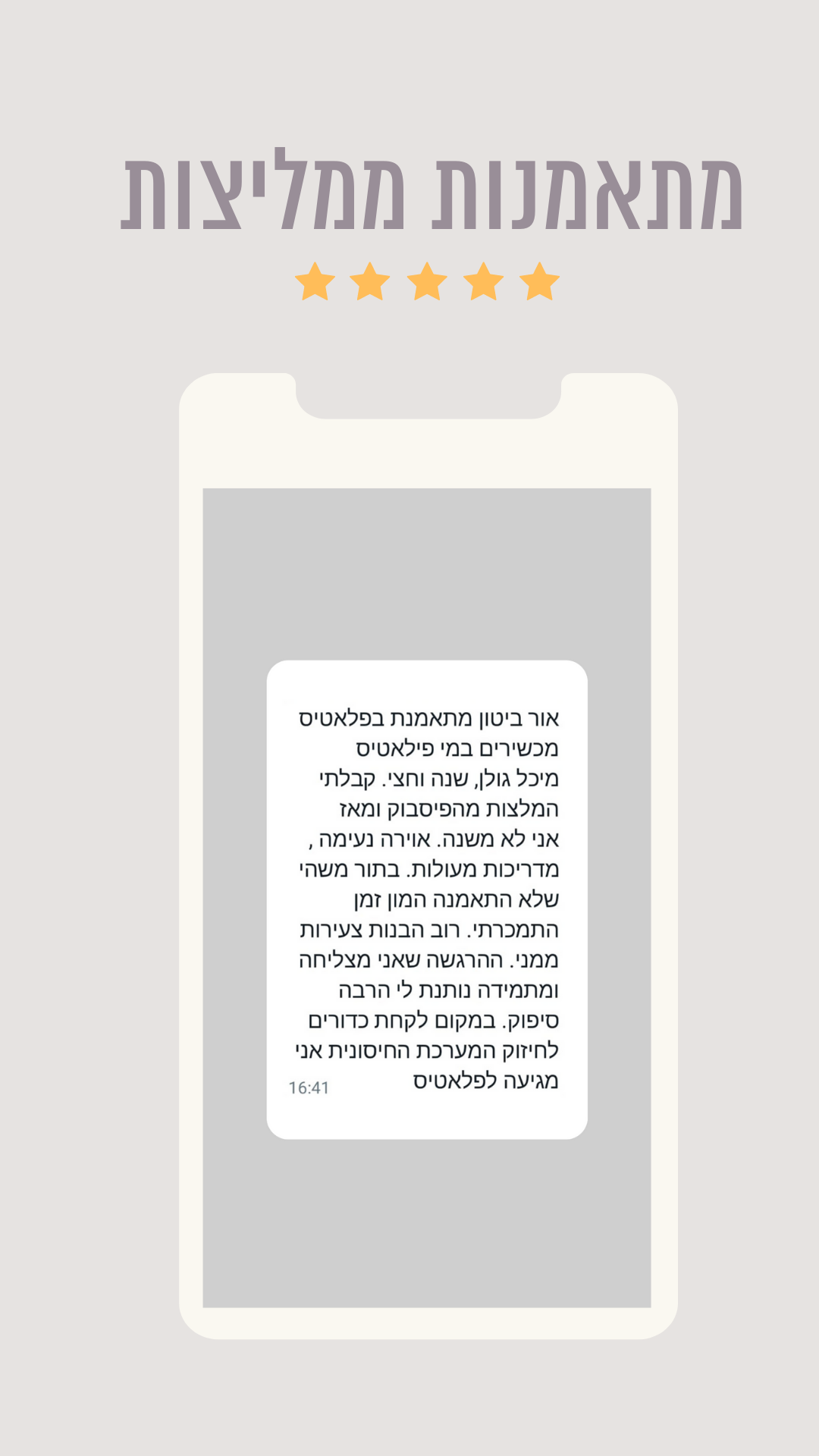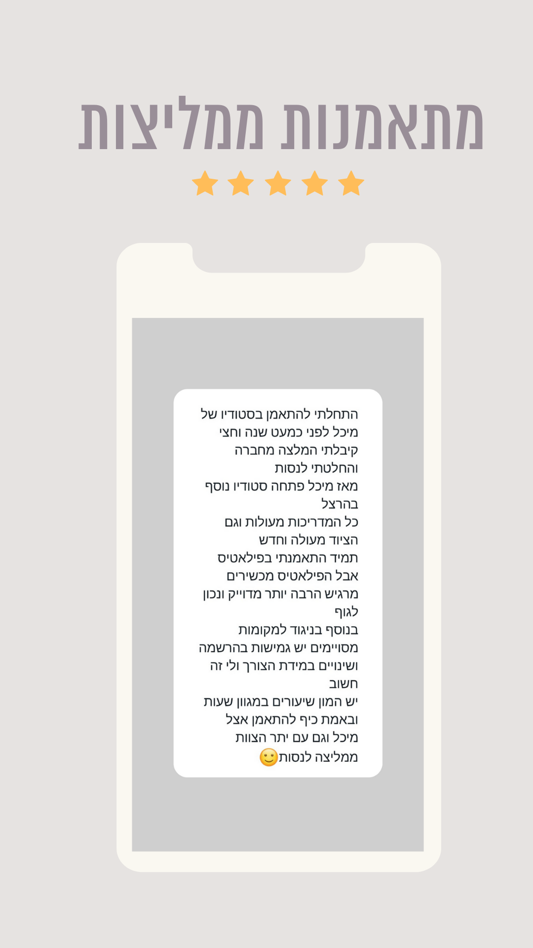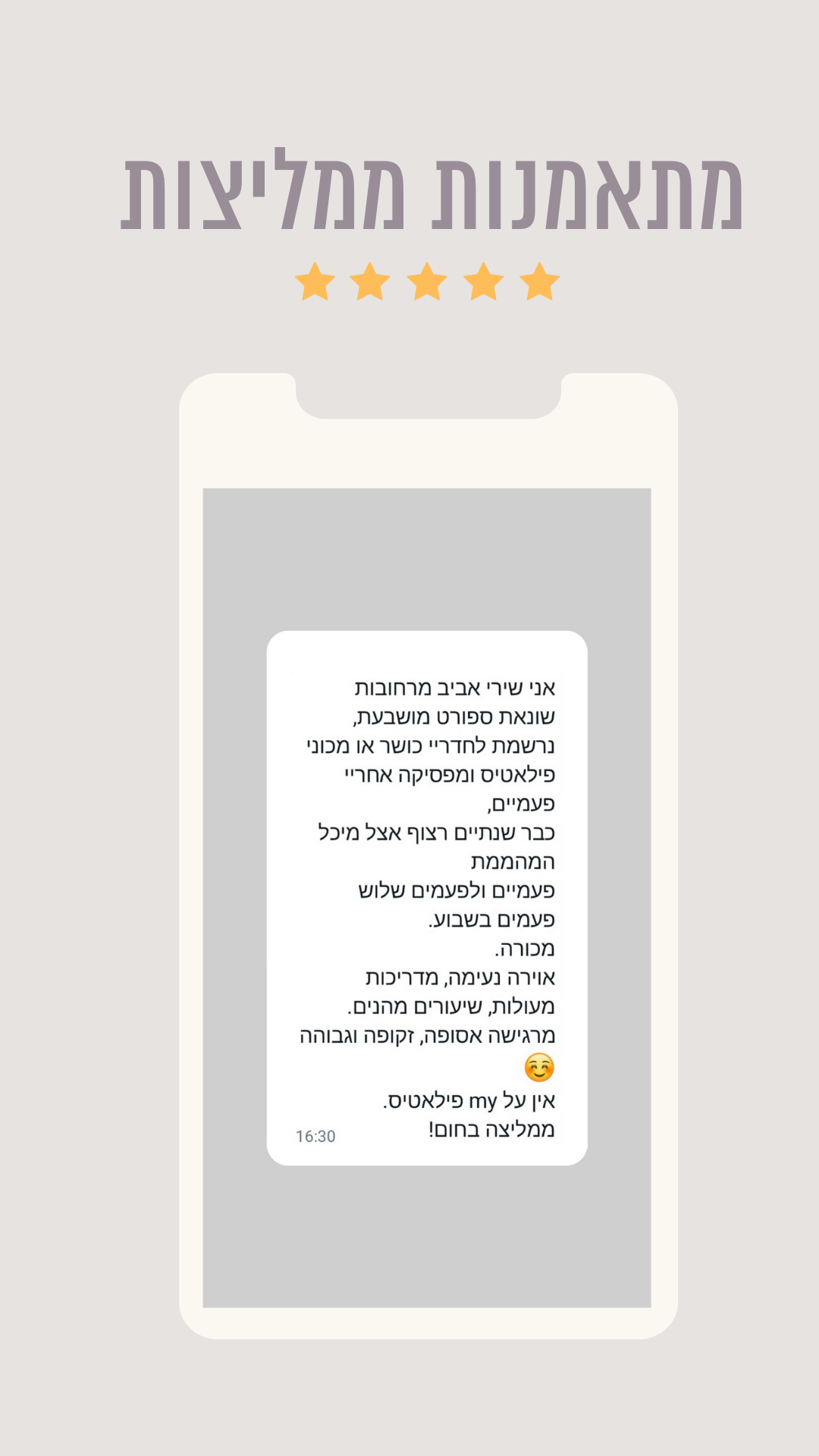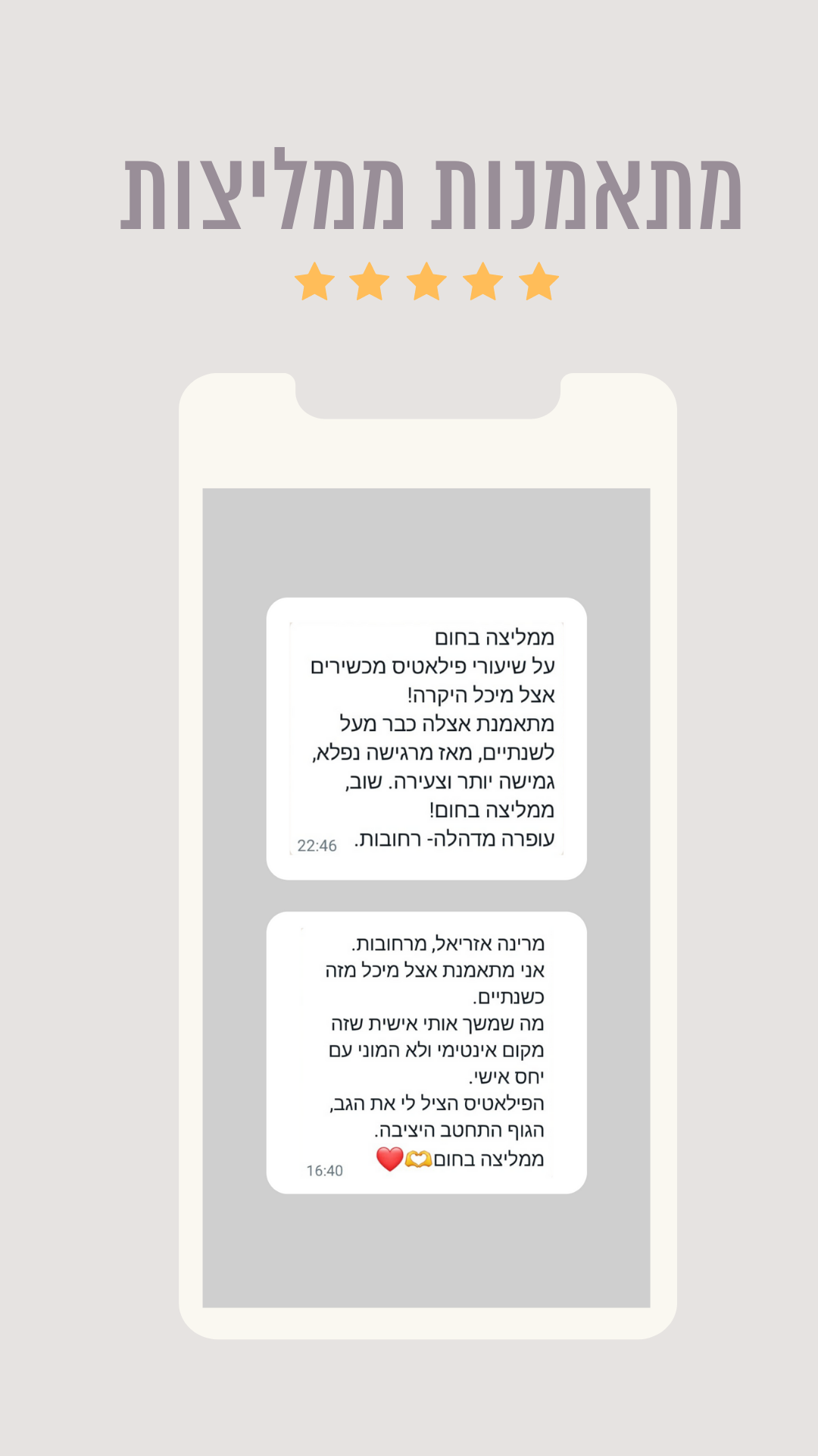 אצלנו תוכלו לעבור תהליכים ולעמוד ביעדים שהצבתם.ן לעצמכם.ן. בMy pilatesעובדים על שיפור יציבה, שיווי משקל, גמישות, כוח, סיבולת שריר, איזון, עיצוב וחיטוב, לצד הקלה על כאבים כרוניים ומתח נפשי.