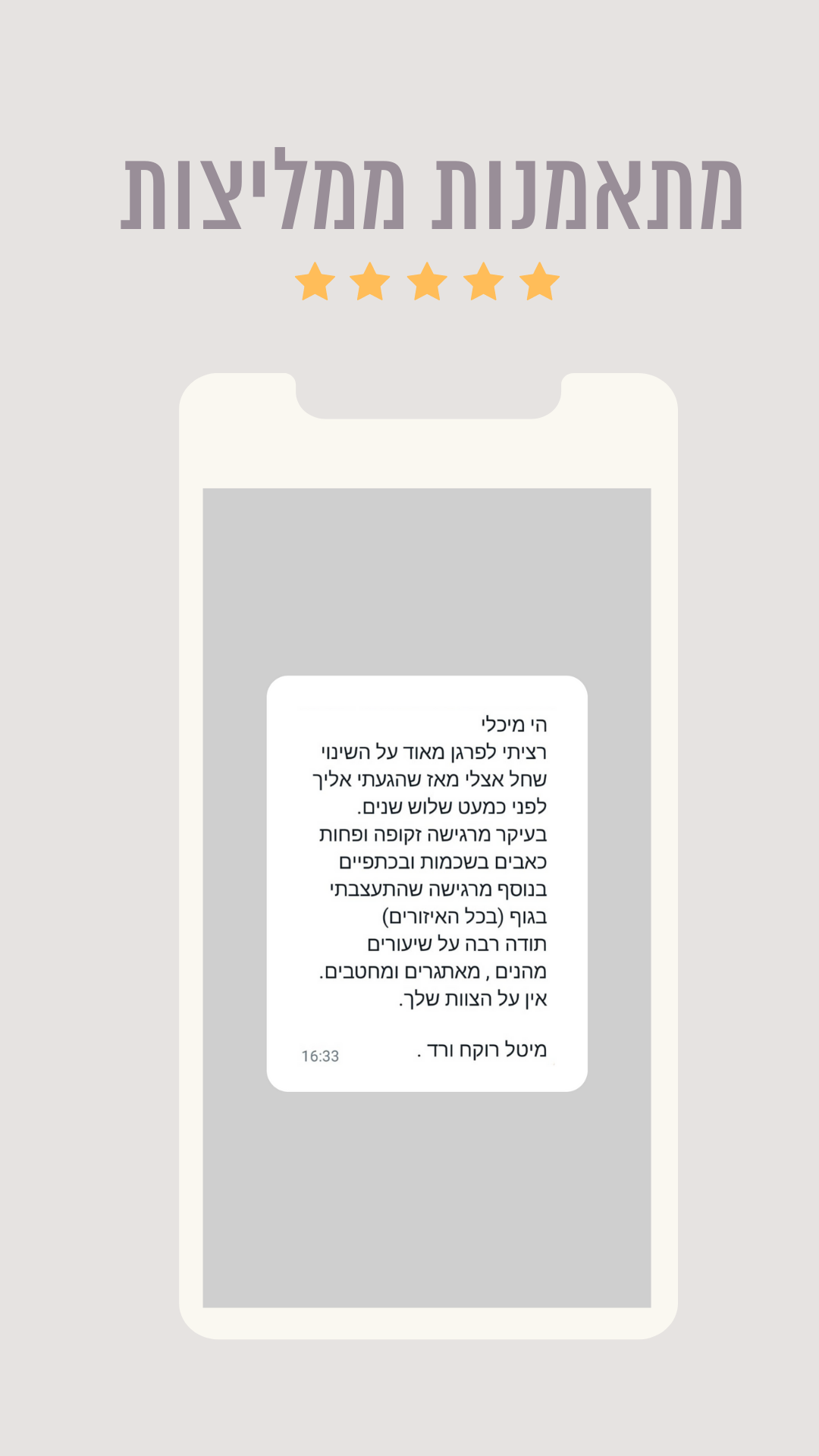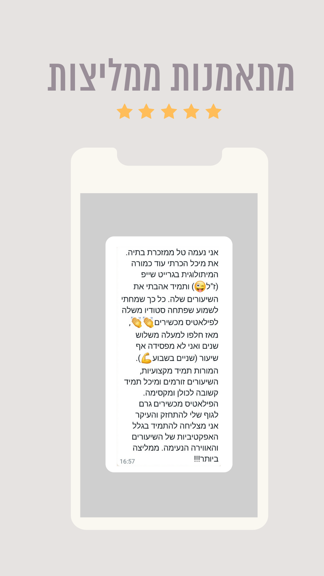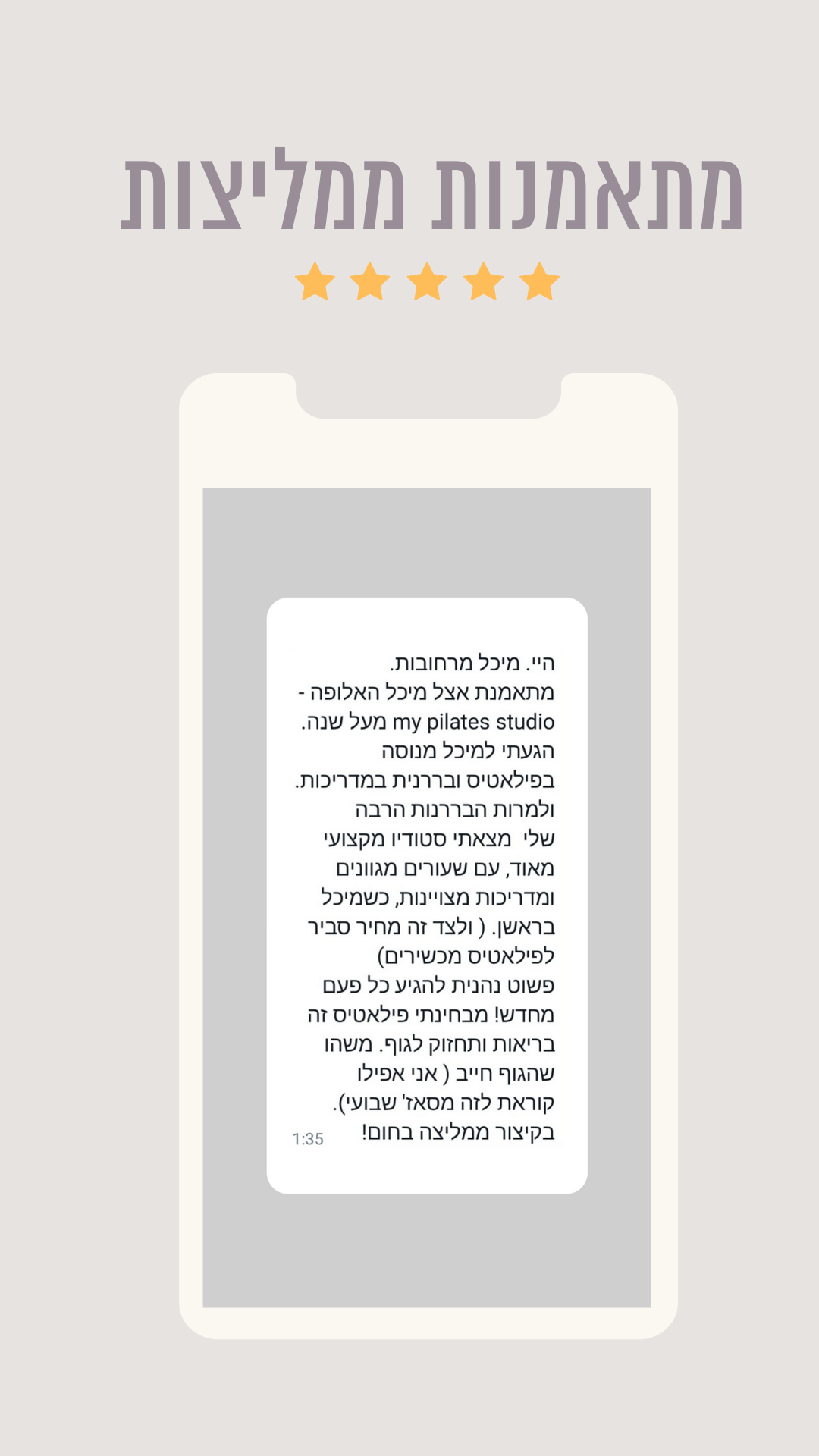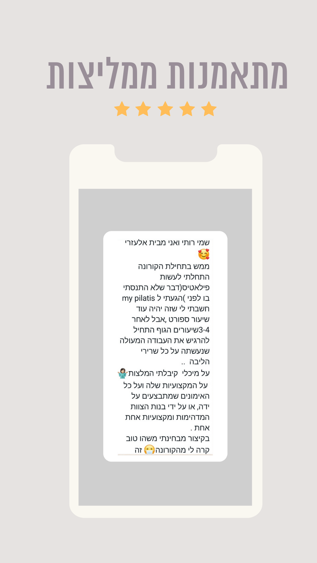 אצלנו תוכלו לעבור תהליכים ולעמוד ביעדים שהצבתם.ן לעצמכם.ן. בMy pilatesעובדים על שיפור יציבה, שיווי משקל, גמישות, כוח, סיבולת שריר, איזון, עיצוב וחיטוב, לצד הקלה על כאבים כרוניים ומתח נפשי.